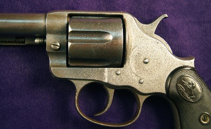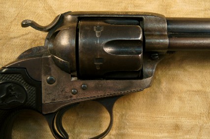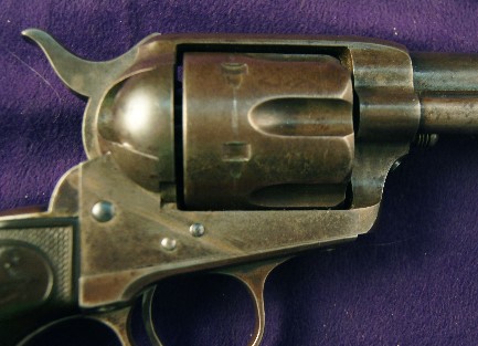 The Colt Bisley Model, named after the Bisley Target Range in England was introduced in a very small quantity in 1895. Most of them were shipped to England and were Flat Top Models, with a few in the standard frame configuration. Production was slow, and very few. It is very sound to state when searching for or Collecting Colts, BLACK POWDER ANTIQUE Bisleys are simply not to be found ! Why ? the large bulk of production, probably 95%++ are all made after December 31, 1898, therefore considered modern. This Bisley .45, with a 4-3/4 inch barrel , Serial No. 18091X was manufactured prior to December 31st, 1898. It has about 45-40% original Factory Blue finish, balance . The case colored frame has abloutv40% case color showing, slightly faded and some silvering.being a blending patina. ALL fcatory applied markings are present and clear: barrel address, frame patents, serial numbers (all matching). the screw heads are crisp, and still have their blue finish. ALL parts are factory original, and the WORKING actions are 100% correct in every mode !The checkered hard rubber grips are in excellent condition, and show hardly no hand wear.