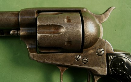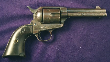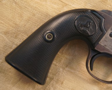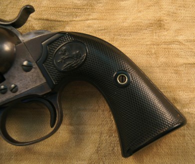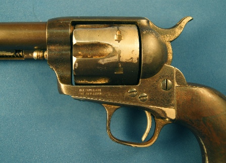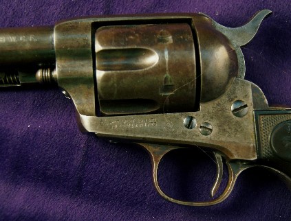 COLT FACTORY LETTER…..HARTLEY & GRAHAM JANUARY 4, 1887 (MANUFACTURED IN 1886) IT APPEARS AS YOU SEE THE COLT. 4-3/4 INCH, BLUE. RUBBER GRIPS, .45 This Colt short barrel Single Action epitomizes the preference of the 1880’s. Easier to handle and convenient. This Colt has perfect mechanical working actions. ALL hammer notch stops are present and hold tight, the cylinder rotates and aligns with the chambers each and every time, locking tight. It releases to fire, as I said NO mechanical issues. The overall finish is a smooth soft medium to dark gray patina, natural and untouched. There are traces of original blue in protected areas and case color hardening very visible on the hammer. ALL factory applied markings are present: frame patents, barrel address, ALL matching serial numbers 11775X, are present and in the correct locations. ALL parts are the original 1886 factory parts with clean screw heads. The hard rubber Eagle Pattern grips show normal hand wear, and the Eagle and checkering are very strong with a soft patina on the grips. This Colt came out of the West Texas area west of Fredericksburg. Undoubtedly carried and used in Texas.