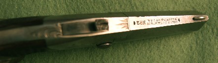 Here we have an Early production NUMBER 2 Deringer from COLT. It remains in very high condition, the grips are exceptional ! varnish, no damage and Crisp Checkering. All the engraving remains strong and quite !! visible as well as sight groove on hammer and checkering. VERY IMPORTANT, the original checkered release to open button is ALL original, and there !! seldom seen on this model! The checkered Walnut grips are exceptional, all the original varnish, crisp checkering NO ! wear. The frame engraving is crisp as is barrel address and the No.2 Marking Serial No. 452X is EARLY production @ 1870-1871, and is all Factory original. RARE FEATURE: Mr. Robert Schwartz a well known Colt Researcher, in the field of Steel and the quality and periods of usage with Colt. In addition the unique history of Strikers ( hammer & firing pin. This No.2 has a long Conical firing pin, normally associated with Center Fire cartridges. The frame also has the round hole for the pin. This shows the thought of Colt to transition to Central Fire Ctg’s after buying the Moore Pattern Deringers, No. 1 & 2. Quoting Mr. Schwartz, “it’s a pretty rare gun, if anyone cares”