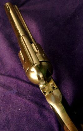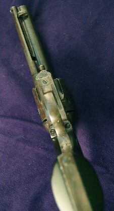 HERE WE OFFER A BLACK POWDER COLT SINGLE ACTION ARMY REVOLVER IN 38/40 CALIBER. THIS IS A STRAIGHT FORWARD ANTIQUE SINGLE ACTION. IT MATCHES THE LETTER, 4-3/4 INCH BARREL, BLUE FINISH, HARD RUBBER GRIPS. THE ORIGINAL BLUE FINSH IS PRESENT AT ABOUT 20% LEVEL. IT HAS BLENDED WITH A SOFT AND ALL ORIGINAL PLUM /GRAY PATINA. ALL FCATORY APPLIED MARKINGS ARE PRESENT. BARREL ADDRESS, FRAME PATENTS, CALIBER MARKING AND ALL MATCHING SERIAL NUMBERS 160227 IN CORRECT LOCATIONS . THERE ARE GOST TRACES OF CASE COLORS AND ALL HAMMER CHECKERING IS SHARP. ALL PARTS ARE THE ORIGINAL FACTORY 1895 PARTS. THE HARD RUBBER GRIPS SHOW NORMAL HAND WEAR FOR 130 YEARS. CHECKERING STILL PRESNT AND THE COLT LOGO AT TOP OF GRIPS ARE WELL DEFINED MOST IMPORTANT. AFTER 130 YEARS ALL THE WORKING ACTIONS ARE IN 100% WORKING ORDER, NO MECHANICAL ISSUES HERE. COLLECTORS TEND TO PLACE THE 38/40 WAY BEHIND THE 45 OR 44, BUT IN ACTUALITY NOT SO MUCH. EXAMAPLE, AN INDIAN TY. OUTLAW BILLY RADLER CARRIED A 38/40 AND WAS KNOWN AS A “SHOOTIST” THE FACT THIS COLT SHIPPED TO CHICAGO, IS SOME WHAT A FACTOR, BUT THE COLTS USED BY THE DALTONS FOR THE ILL FATED COFFEEVILLE JOB WERE BOUGHT AR HIBBARD SPENCER AND BARTLETT, WHILE ON AS WE SAY TODAY VACATION, THEY WERE MAKING THEMSELVES SCARCE. ONE LAST FACTOID: THE LAST HORSE MOUNTED BANK ROBBER FROM INDAIN TY. HENRY STARR WAS KILLED LATER IN LIFE IN THE EARLY 20TH CENTURY, STILL PRACTICING HIS ‘TRADE” SHOT WITH A 38/40 IN THE BANK , LATER PASSING ON. THE SAA 38/40 WAS DESCRIBED AS FLAT SHOOTING , HARD HITTING AND ALLOWED MULTIPLE SHOTS WITHOUT HAVING TO RE-SET YOUR AIM.