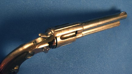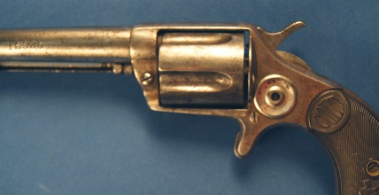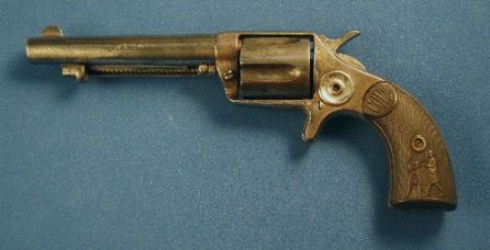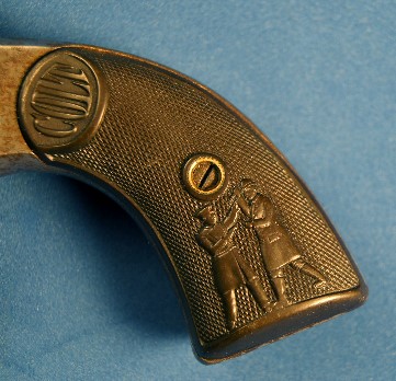 This Colt Revolver is one of the LOWEST production models from Colt, LESS than 4,000 were manufactured. It is also one of the MOST unique offerings from Colt, due to it’s grips ! The checkered Hard Rubber Grips were embossed, with NOT an Eagle, but a Cop and Thug ( Robber) in a confrontation. The Thug has a knife and the Cop is attempting an arrest.