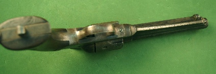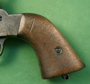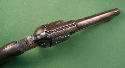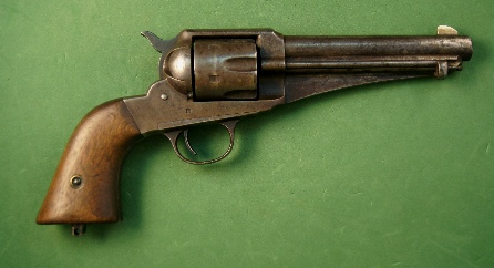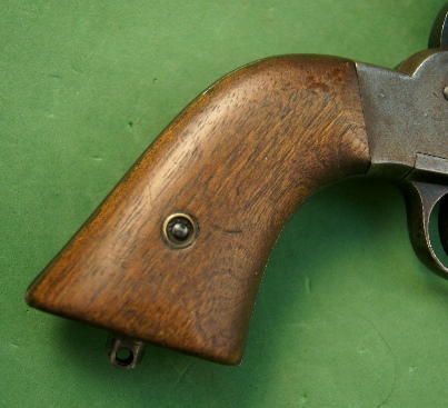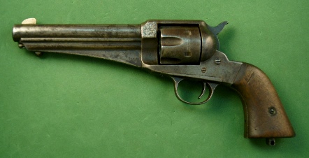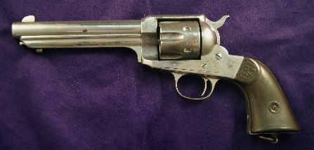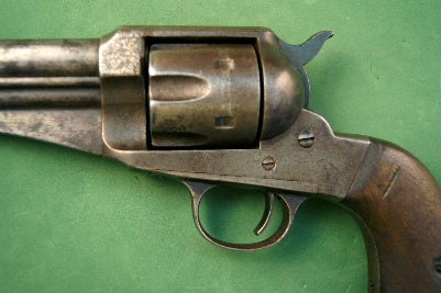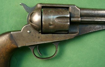 This is an Extremely Rare Remington M..44 Caliber. It is a Factory 5-3/4 inch barrel model of 1875. In quoting Flayderman 9th edition, ONLY a few were made, and considered worth a Premium. In the many decades I have been in the Antique Arms business, I cannot recall when last I have ever seen one, besides this one. In addition it has another scarce factor, it was made a Factory Blue revolver. the vast majority of 1875’s were nickel plated. It is 100% Original, all parts and components. Only missing the actual Lanyard Ring, as the Ring Guide is still present. MOST Important, it is 100% correct on ALL of the Working Actions. It cocks, cylinder rotates precisely and indexes correctly, each time the hammer is cocked. It cocks and locks ! and releases to fire perfectly. It has it’s original Walnut grips. The original blue has faded and mixed with a soft gray/plum patina. It has never been cleaned or buffed, all original natural finish after about 145 + years. This example is Serial No. 12X / Possibly Batch No. 12X the grips have a smooth natural hand patina, **with one deliberate notch line on the upper left grip, deliberately place there. All screw heads are clean and crisp. It’s just a very clean and pleasing appearance for a very rare Remington 1875.