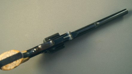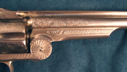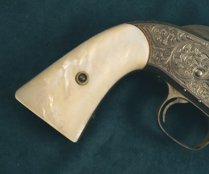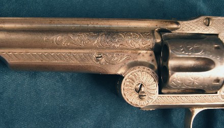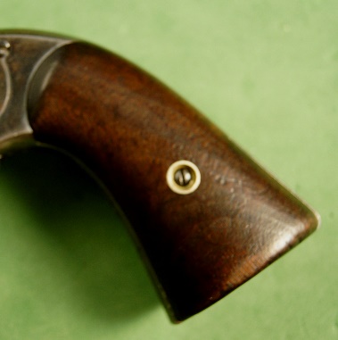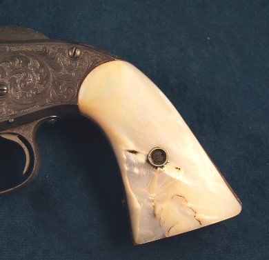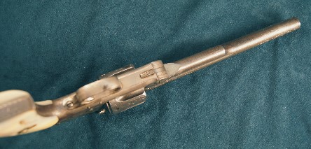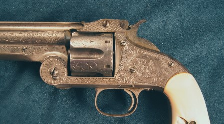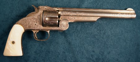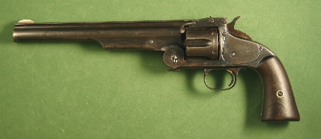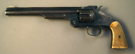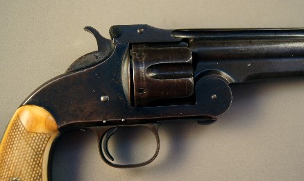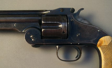 This was an incredibly significant revolver for the firm of S&W. It was the FIRST .44 caliber revolver they introduced, and first top-break system for loading and unloading. This offered QUICK loading and quicker unloading times, a real advantage. Many of the well known Frontiersmen immediately began carrying one. Buffalo Bill in his pre Show days, Texas Jack Omohundro, Dallas Stoudenmire , and many others. They appreciated the smooth action, grip shape and balance, and all its superior features. Remember this was THREE full years before any Colt Single Action. This 1st American, Serial No. 512X, from 1872, remains in superb ! condition. It has about 85% original blue present, the balance a smooth blending patina. the case hardened/ color on the hammer and trigger guard has slightly faded. ALL factory applied markings are present and distinct: barrel address , serial numbers. Mechanically, the working actions are PERFECT, NO mechanical problems. The Deluxe checkered Ivory grips are stunning, and bear all the characteristics of a 151 year old grip: color striations and NO damage.