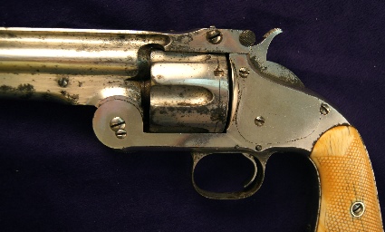 This was an important revolver for S&W, it was the FIRST .32 Rim Fire Model revolver, preceding the No.2 Army. It was a small production of only @26,000 revolvers, and beyond that, ALL the parts were manufactured by King & Smith of Middletown, Ct. S&W assembled all the revolvers and sold them. This revolver Ser. No. 1358X, received top of the line embellishment. It is Engraved by Louis D. Nimschke, all surfaces receiving engraving. Further it is fitted with the ORIGINAL Factory or Nimschke shop, Pearl Grips, which remain in perfect condition. The engraving is intricate and still clear and sharp. The Pearl grips are perfect in radiance and color, with no damage. It has the standard 3-1/2 inch octagonal barrel, five shot cylinder. Regarding the finish: it has about 97-98% original nickel plate finish. What is interesting is the nickel plate, as it shows all the characteristics of the early nickel plating. It is a softer finish , the bright nickel finishes were a few years away. In material published by Robert (Bob) Schwartz of San Antonio, Texas, it exhibits the early Boetinger process of finish. A softer less brilliant finish, the bright nickel came later after improvements in the process. Mechanically this 1-1/2 operates 100% correctly, it “tips -up” to open, the cylinder can be loaded, replaced and the revolver closes perfectly. The cocking action is also perfect, as it cocks, indexes, locks tight and releases to fire. As I said a perfect mechanically functioning revolver. This is a splendid Engraved example, by the Master Engraver, of the First Model ( Old Model 1-1/2) suitable for all collectors.